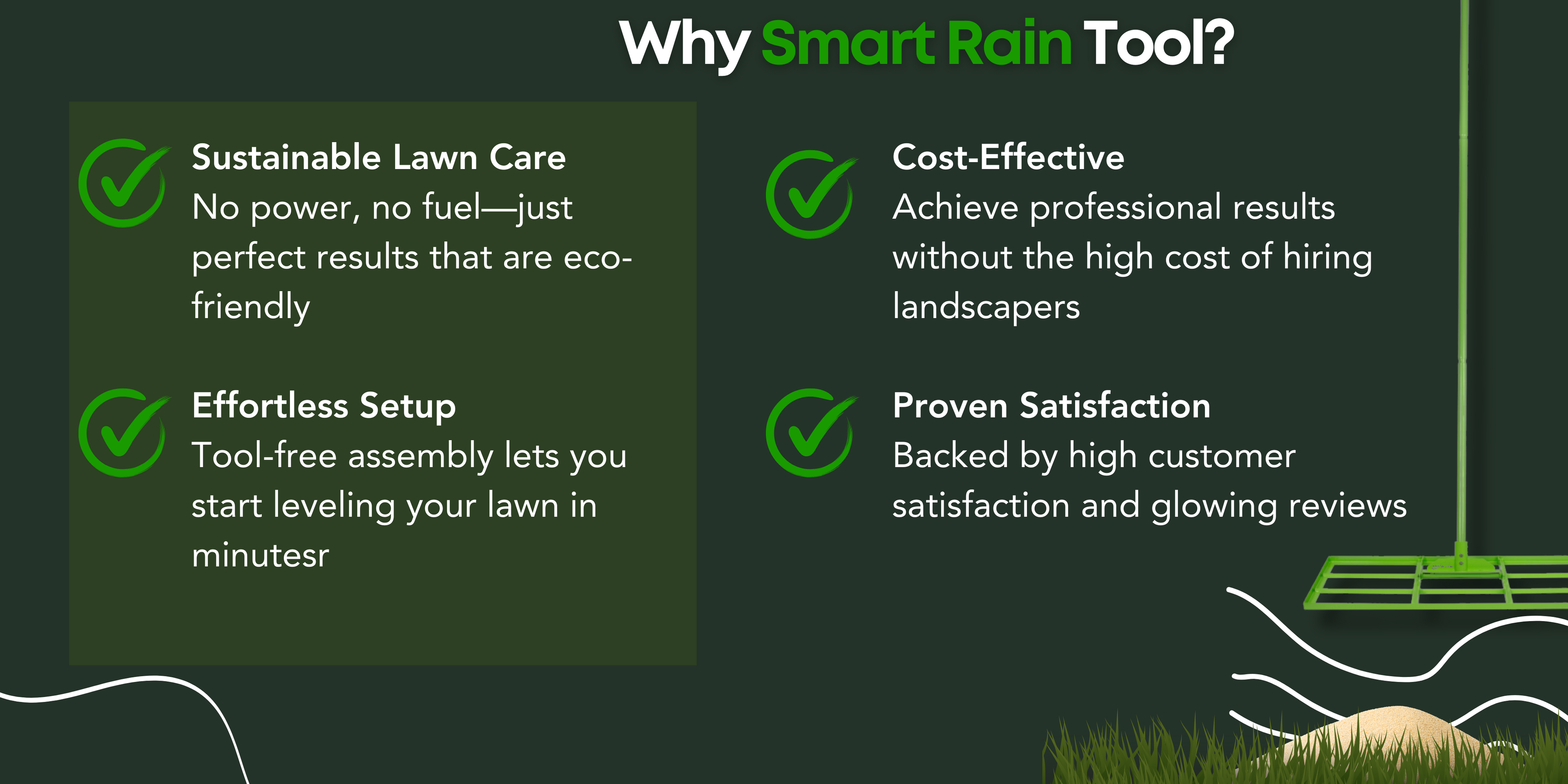 At SmartRain, we empower homeowners and professionals with premium tools and equipment, meticulously designed and engineered to the highest standards. Our innovative solutions simplify and enhance the process of building and maintaining beautiful lawns. Committed to quality, precision, and customer satisfaction, we ensure every tool—from our top-tier lawn leveling tool to our full range of landscaping equipment—meets the demands of those who expect excellence. Trust our expertise and craftsmanship to deliver flawless results, every time.
